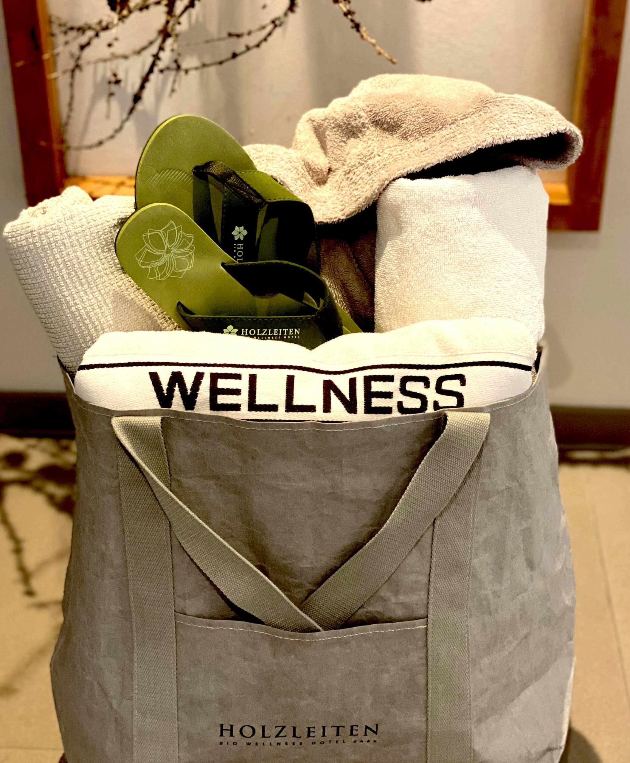 Die Badetasche beinhaltet einen Bademantel, Saunatücher, Handtücher, Flip-Flops zur Nutzung für die Dauer Ihres Aufenthaltes.